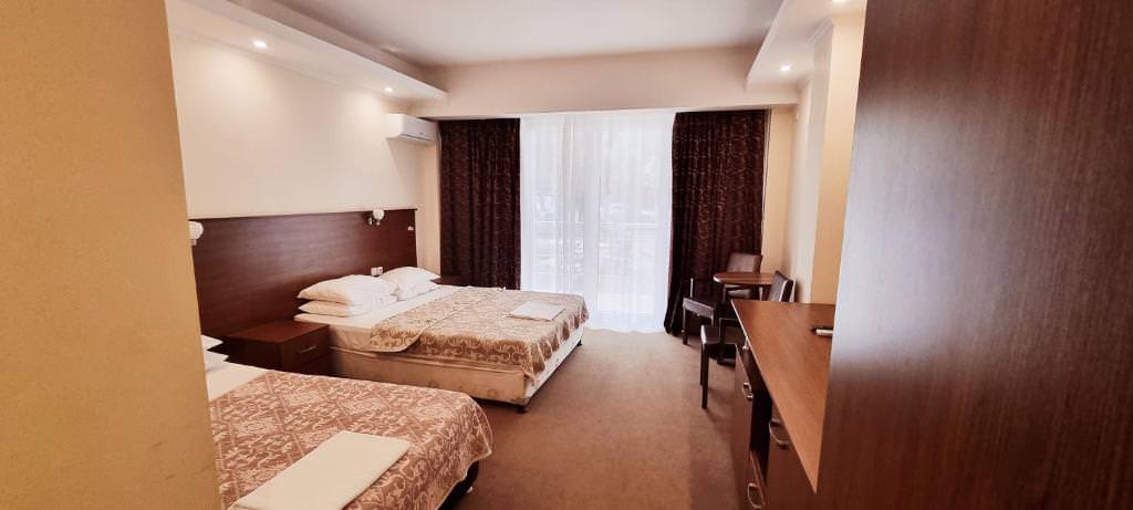 В номере две большие кровати, кондиционер и телевизор. Есть выход на балкон